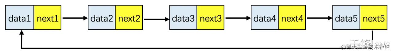 如果,我们将链表的最后结点的next指针域做下修改,由原来的指向null修改为指向第1个结点,则整个链表就变成了一个环路。以单向链表进行操作,如下图所示: