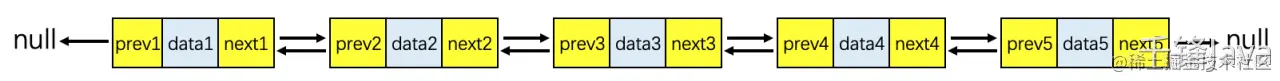 - 第1个结点作为整个链表的首结点,该结点的prev1指针内容为null,表示没有前一个结点。