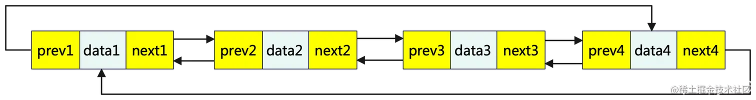 - 除此之外,中间三个结点,next指针和prev指针分别指向下一个结点和前一个结点,可以实现双向查找。