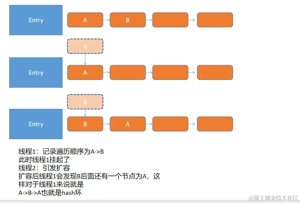 这时线程1挂起。线程2引发扩容,扩容后为B->A。这时线程1遍历就会发现A的下一节点是B,会发现遍历B时B还有后续的节点为A,这样就出样链表环了。