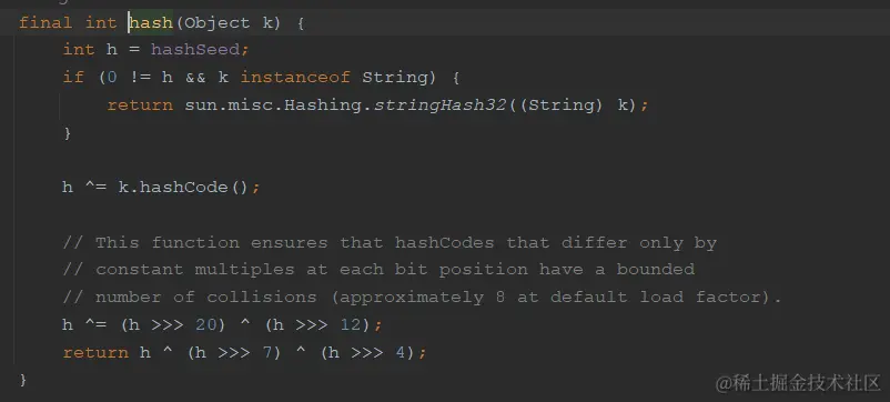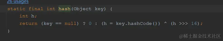 JDK 1.8 中,HashMap 使用了拉链法和红黑树两种冲突解决策略。当链表长度超过一定阈值时,会将链表转换为红黑树。红黑树是一种自平衡二叉树,具有较高的查询性能。以下就是JDK1.8中的hashcode扰动函数。