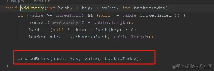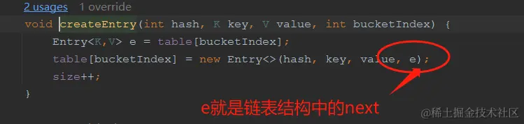 插入元素使用createEntry,新元素会的next指向table[bucketIndex]也就是链表的头节点。