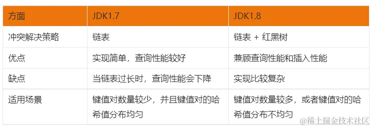 | 冲突解决策略 | 链表 | 链表 + 红黑树 |