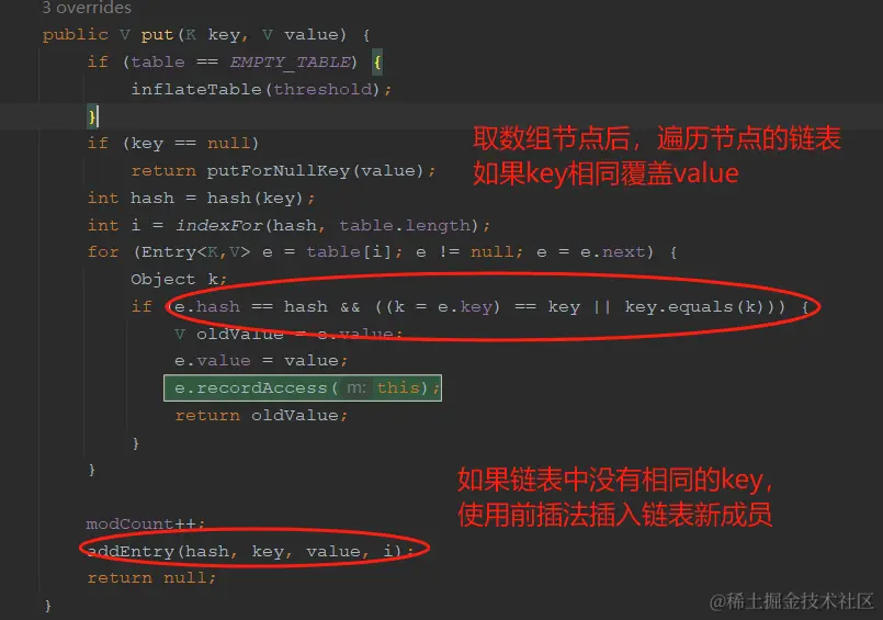 public V put(K key, V value) { // 如果哈希表为空,则对其进行申请数组空间 if (table == EMPTY_TABLE) { inflateTable(threshold); } // 如果 key 为 null,则将其放入 null 键的特殊位置 if (key == null) { return putForNullKey(value); } // 计算 key 的哈希值 int hash = hash(key); // 根据哈希值和哈希表的长度计算索引位置 int i = indexFor(hash, table.length); // 遍历索引位置上的链表,寻找 key for (Entry<K,V> e = table[i]; e != null; e = e.next) { // 如果 key 相同,则更新 value 并返回旧值 Object k; if (e.hash == hash && ((k = e.key) == key || key.equals(k))) { V oldValue = e.value; e.value = value; e.recordAccess(this); return oldValue; } } // 如果 key 不存在,则添加一个新的链表成员 modCount++; addEntry(hash, key, value, i); return null; }
