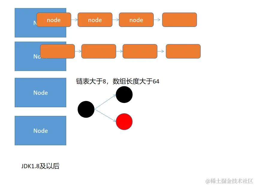这样,当 HashMap 出现 hash 冲突存放到链表中同时满足条件的情况下,会将链表转换为红黑树,提高查询性能。