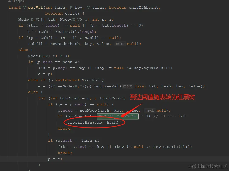 当链表的节点数量达到阈值(默认为 8 ),执行 treeifyBin 方法