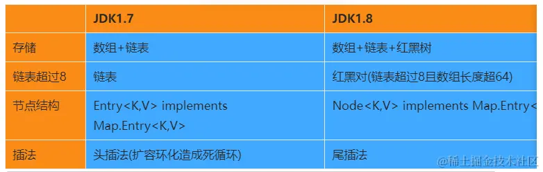 以下是 JDK1.7 和 JDK1.8 中 HashMap 解决哈希冲突方法的具体对比:
