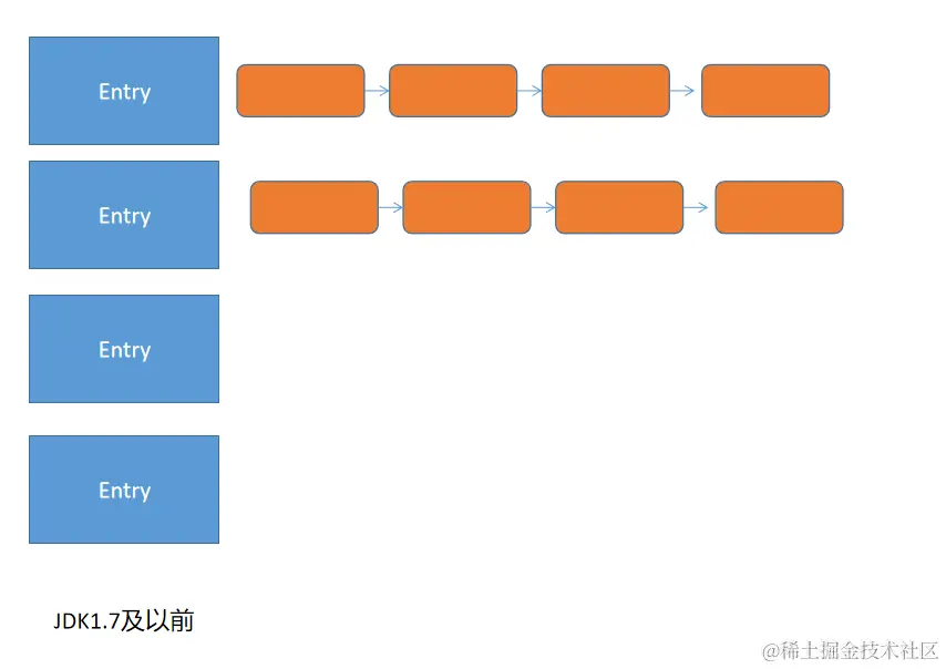 - Entry 是在 JDK 1.7 及之前的版本中用于存储键值对的数据结构。
