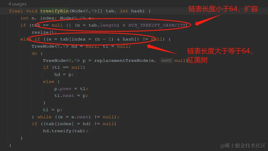 进入treeifyBin方法后还有一个逻辑就是当数组长度大于或者等于 64 的情况下,才会执行转换红黑树操作,以减少搜索时间。否则,就是只是对数组扩容。所以链表长度大于阈值不是转为红黑树的唯一条件。