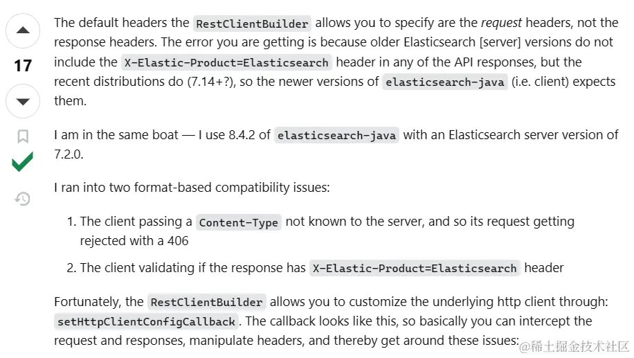 - 客户端需要验证 response 中是否具有 X-Elastic-Product=Elasticsearch 标头,但服务端并没有返回这个。