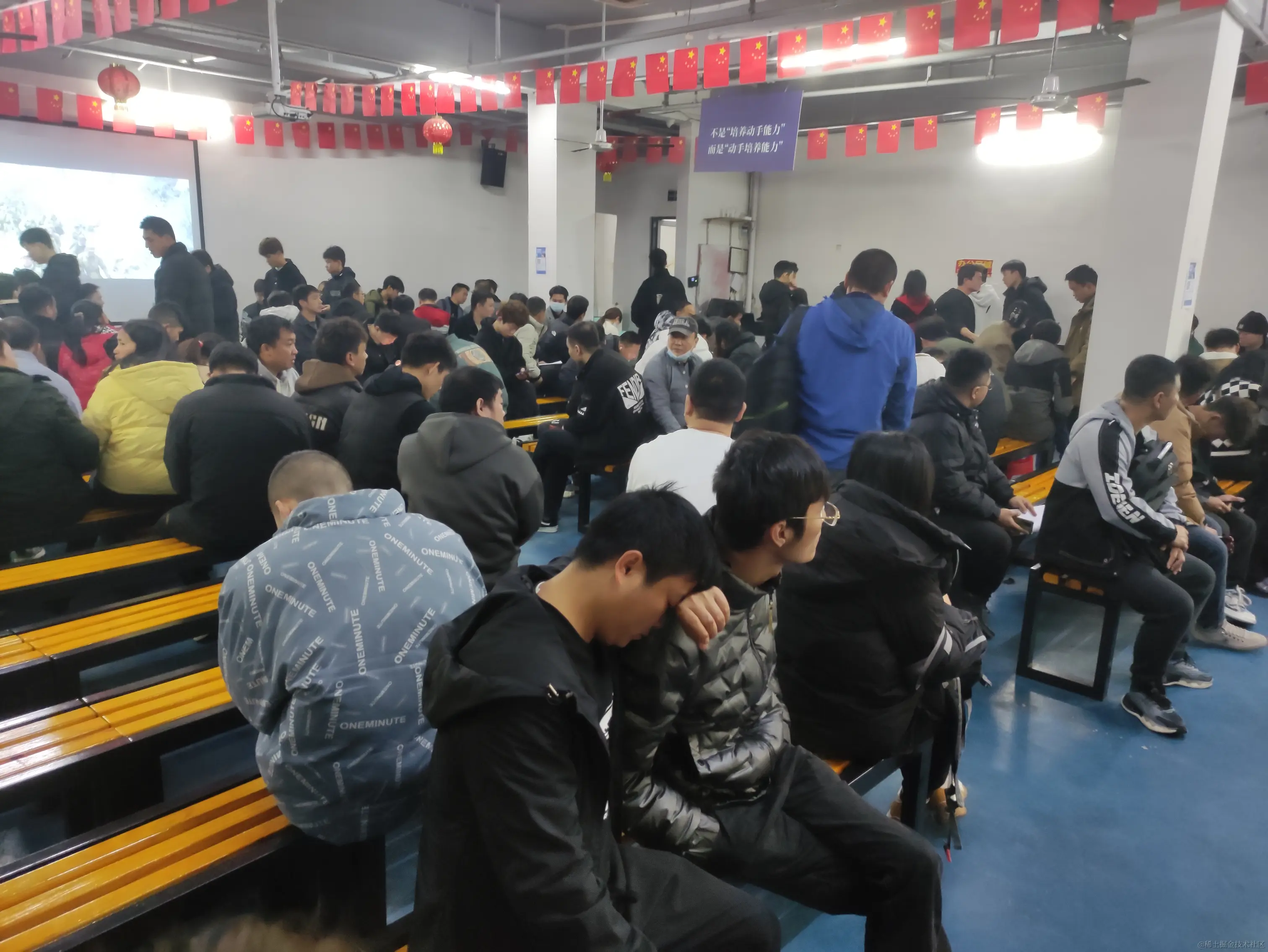 等了一会之后,这个面试点就陆陆续续的来了二三十个人,也还是和我上次看到的人群一样,大包小包,蛇皮袋+黑色行李箱。此时我内心就不仅感慨,为了个工作也是不容易。等了差不多十几分钟就有个嗓门大的人喊,要面试的人跟我来,带上行李,没行李的不要来。就这样,我和主人公 A 被带到了一个不是很大的大厅,里面差不多容纳了几百人,此时我又被触动了(是的,以我目前的认知,我这段经历会被触动很多次),感觉进了传销一样。