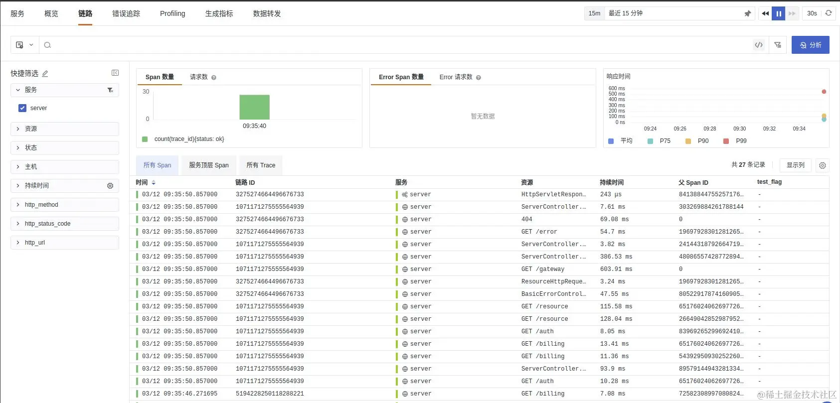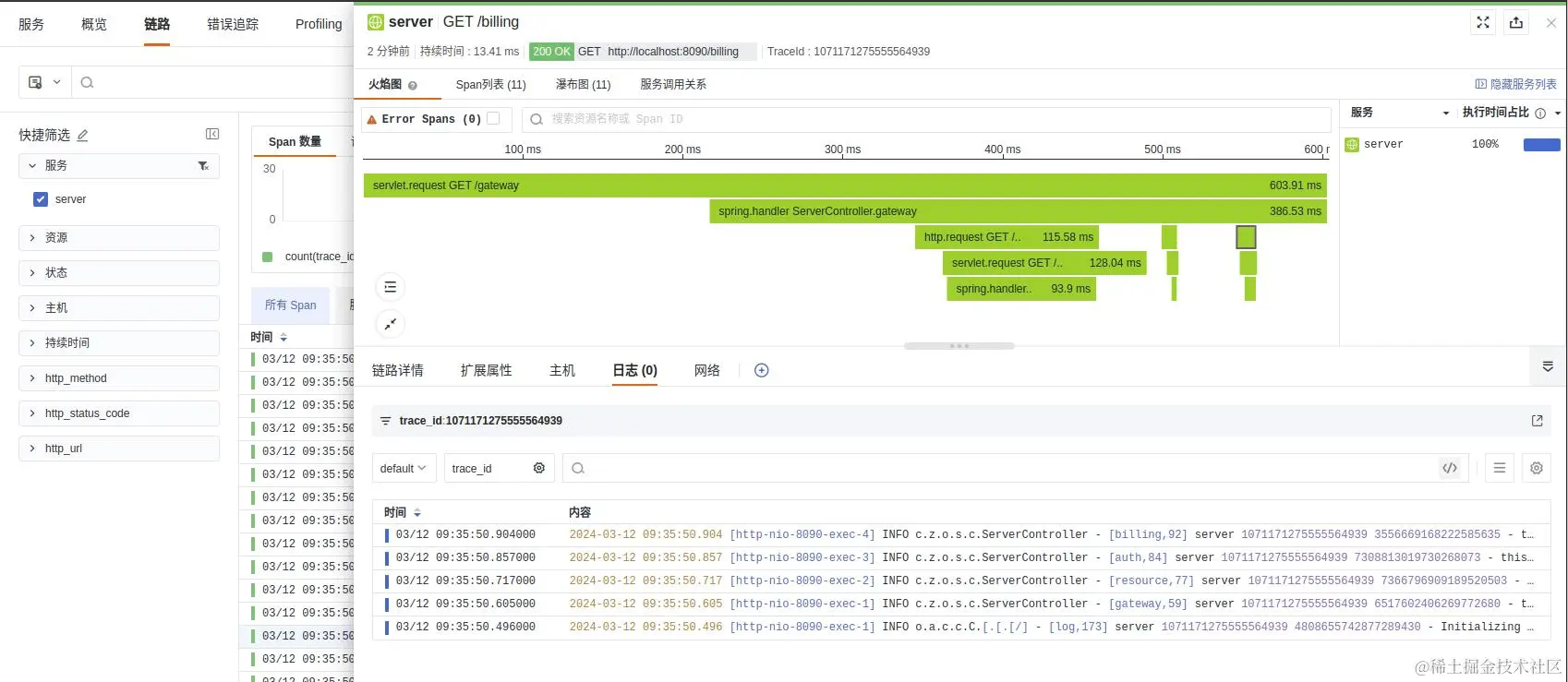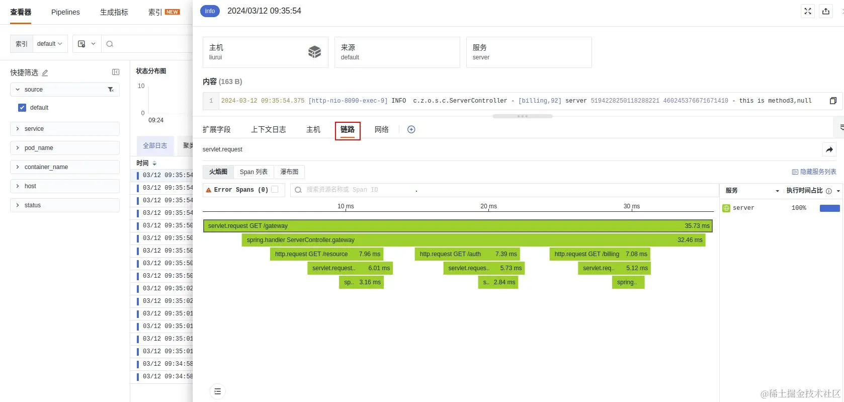 通过链路可以关联到日志信息,反之亦然,实现了日志与链路的联动效果。