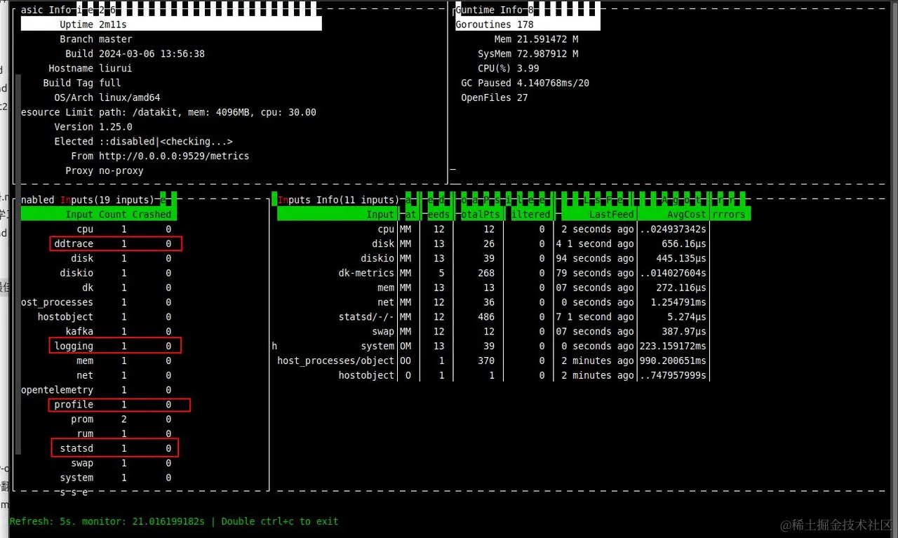 通过 datakit monitor 命令可以观察到采集器是否启动成功。
