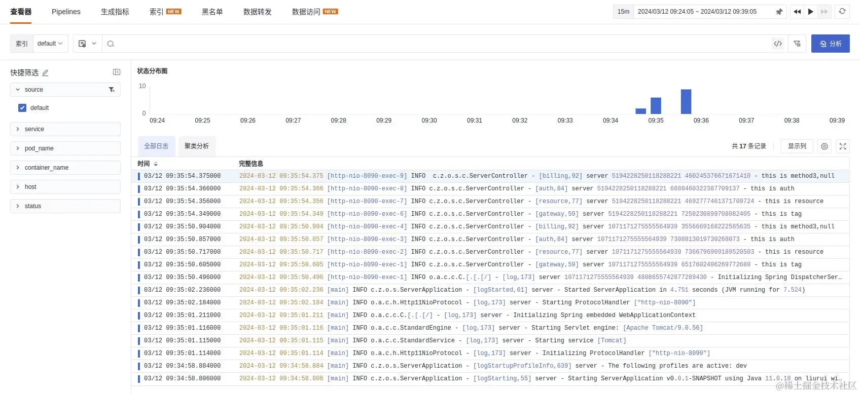 logfiles = [ "/home/liurui/code/observable-demo/logs/server/server.log" ] # 服务名称,非必填 service = "server" ## Grok pipeline script name. pipeline = "server.p"