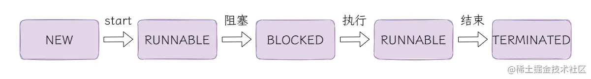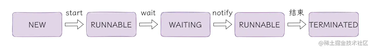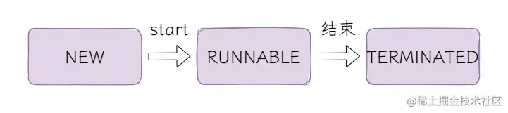 这里指的是线程从创建后(NEW),到启动后(RUNNABLE),再到最后终止(TERMINATED)的一种无竞争线程状态转换。