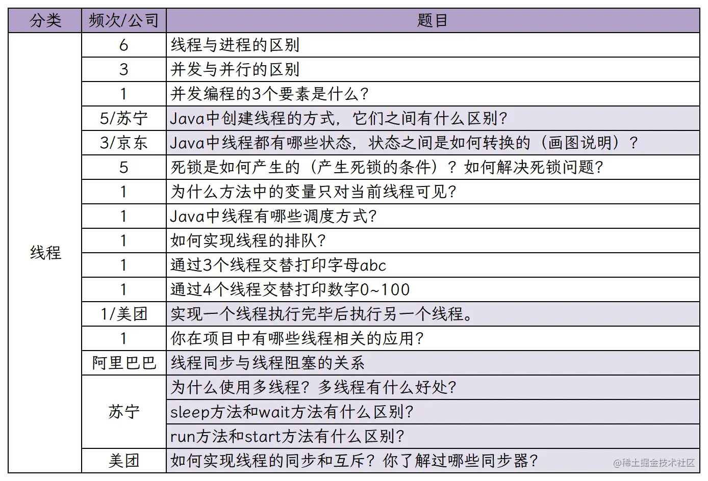 数据大家都看到了,接下来看看各大公司都会问哪些关于线程的问题。这部分题目主要收集自某准网面经,浅紫色底色的题目是我和小伙伴在面试过程遇到过的。
