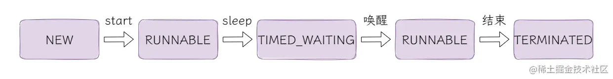 线程t创建后,进入NEW状态,启动后进入RUNNABLE状态,线程休眠100ms,进入TIMED_WAITING状态,休眠时间结束后,进入RUNNABLE状态,最后线程执行结束,进入TERMINATED状态。