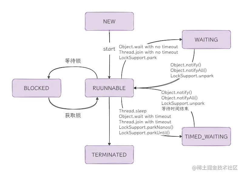需要注意,Java中并未定义线程的RUNNING状态,而是通过RUNNABLE包含了RUNNABLE(可运行)和RUNNING(运行中)。