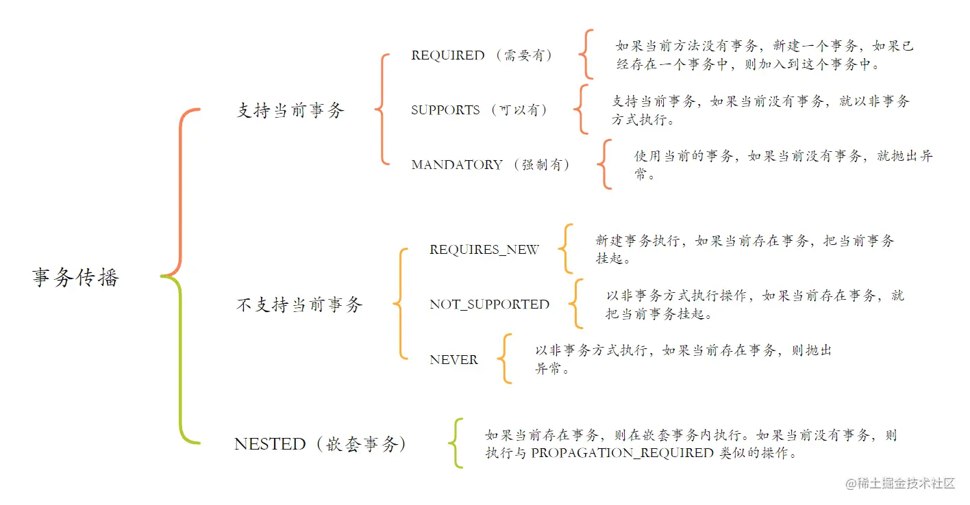 - Propagation.SUPPORTS:如果当前存在事务,则加入该事务;如果当前没有事务,则以非事务的方式继续运行。