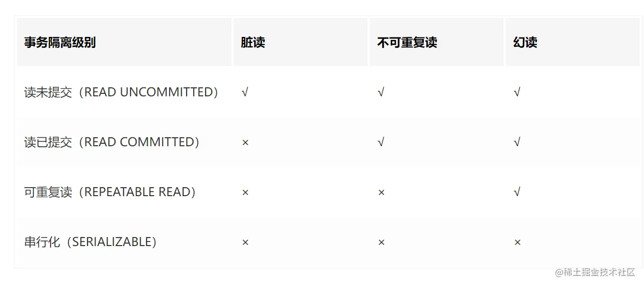 所以,相比于 MySQL 的事务隔离级别,Spring 中多了一种 DEFAULT 的事务隔离级别。 事务隔离级别与问题的对应关系如下: