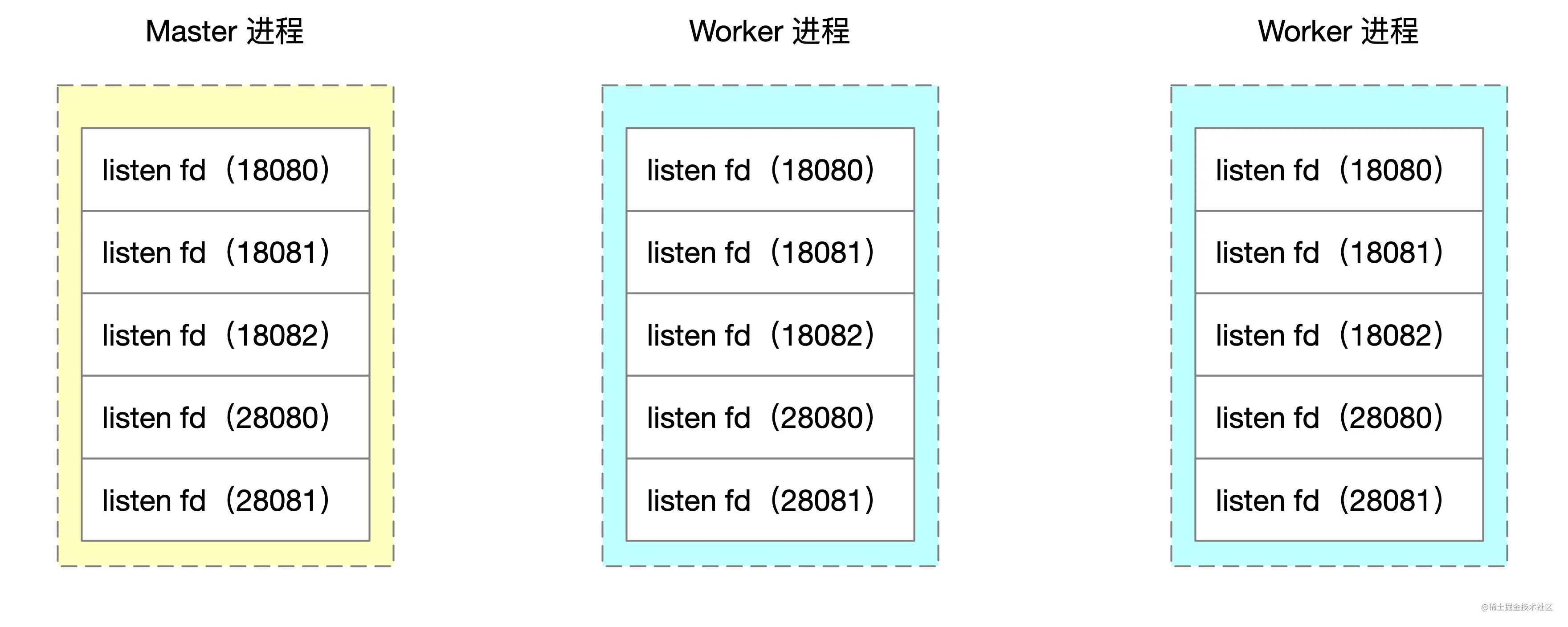 Nginx 采用多进程模式,master 进程会调用 bind、listen 监听套接字。fork 函数创建的 worker 进程会复制这些 listen 状态的 socket 句柄。