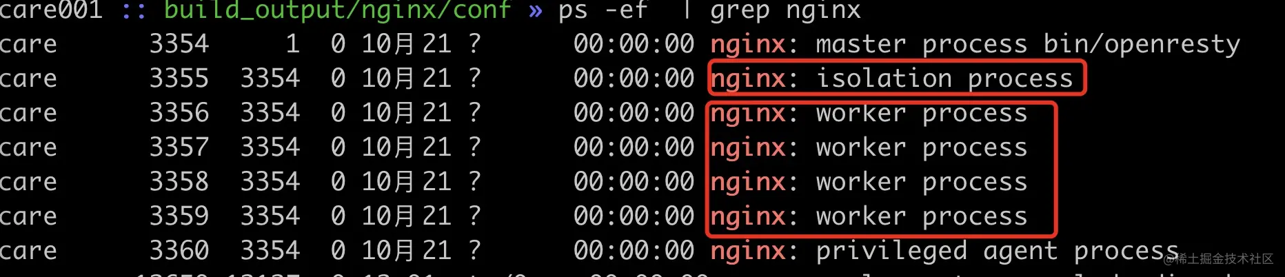可以看到现在已经启动了 1 个内部隔离 worker 进程(pid=3355),4 个普通 worker 进程(pid=3356~3359)。