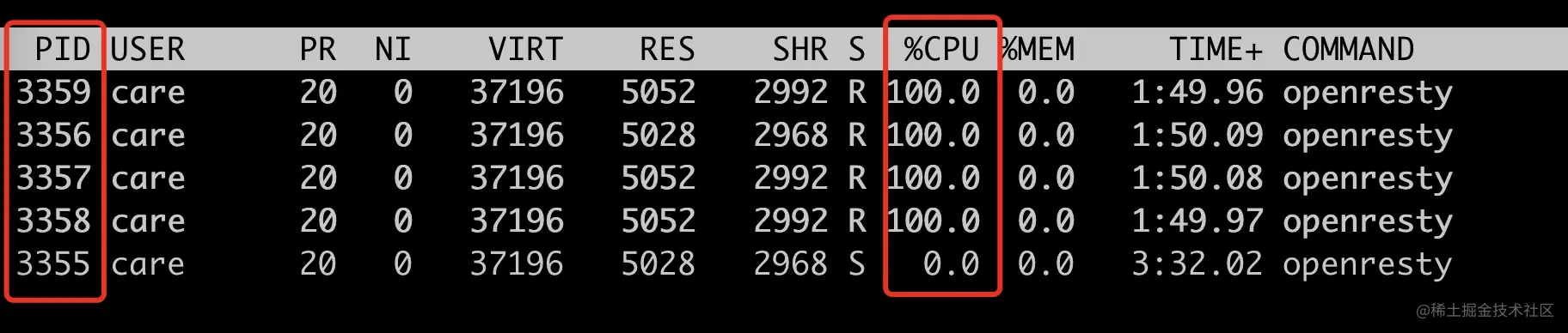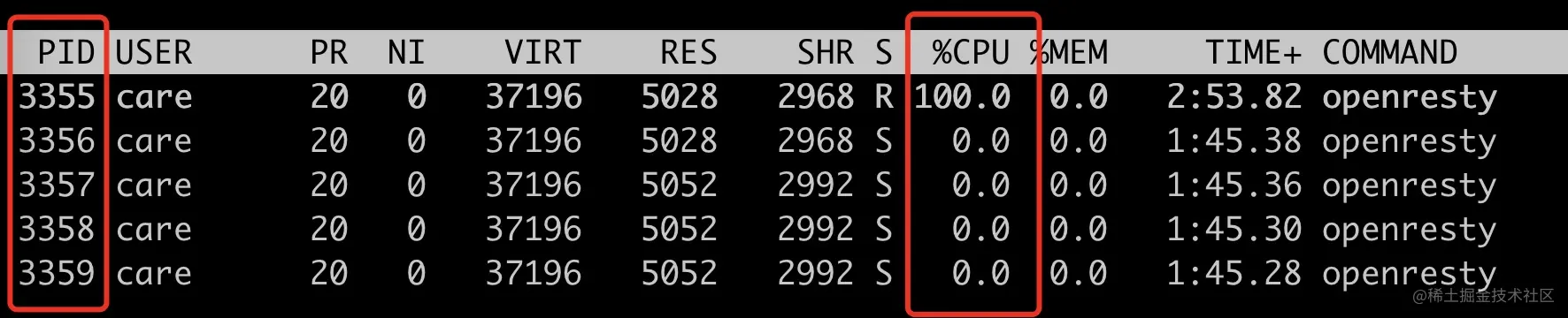 符合预期,只会跑满 4 个普通 worker 进程(pid=3356~3359),此时 3355 的 cpu 使用率为 0。