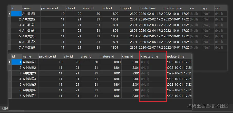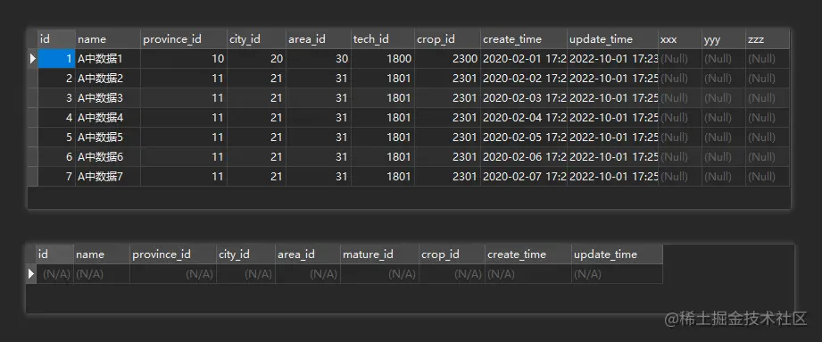 A 表字段:name, province_id, city_id, area_id, tech_id, crop_id, field_id, create_time, update_time, xxx, yyy, zzz, ...