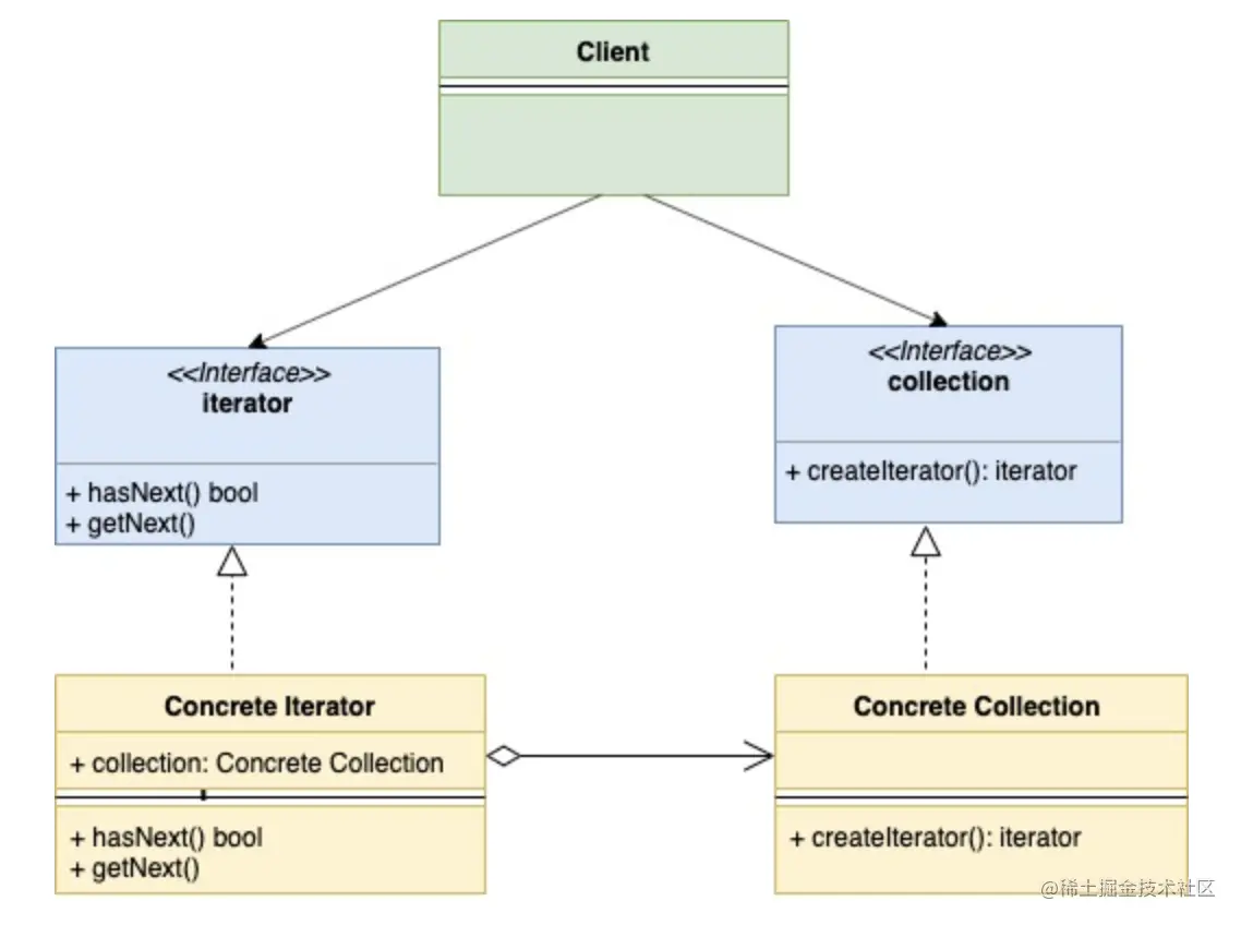 迭代器模式属于 GoF 总结的 23 种设计模式中的行为型模式。在这种模式中,集合结构会提供一个迭代器。通过这个迭代器可以顺序遍历集合中的每个元素而不需要暴露其具体的实现。其结构,可以用下面这个 UML 类图表示: