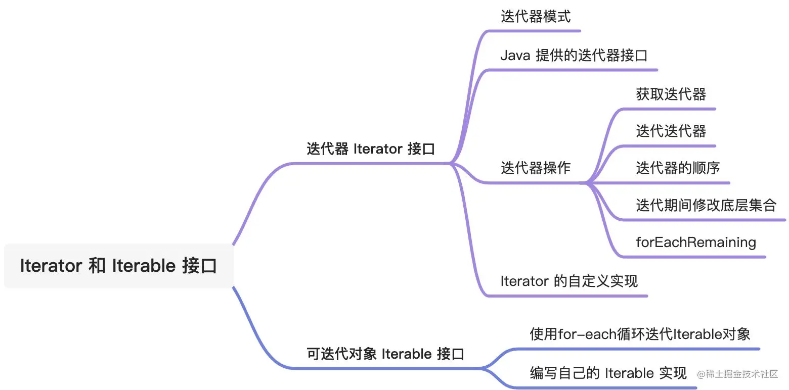 Iterator 和 Iterable 这两个接口在命名上相似,新手学习时容易混淆,所以在这里把两者展开,梳理明白。本文大纲如下: