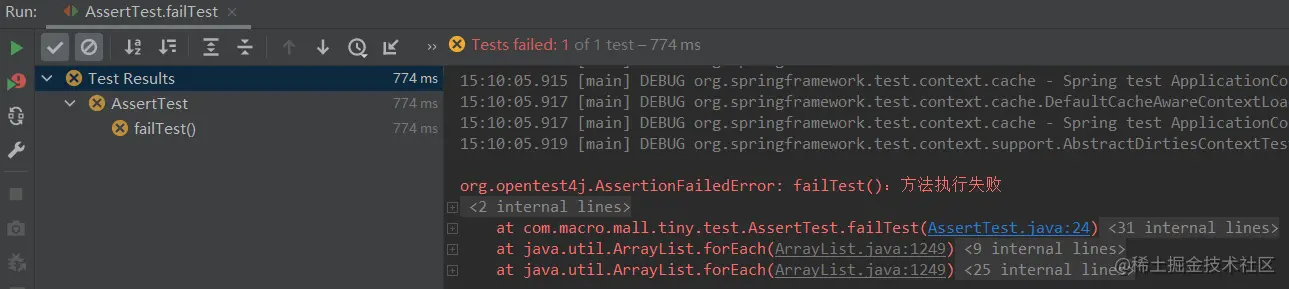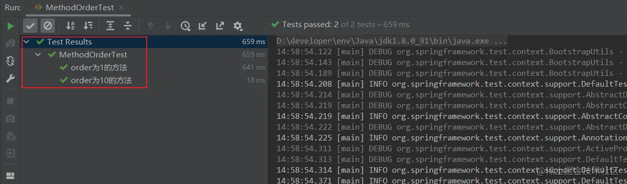 @DisplayName注解给测试方法取了个别名,而且我们使用了@ExtendWith指定了运行环境为Spring而不是Spring Boot,所以日志中不会出现Spring Boot的banner,执行速度也更快。