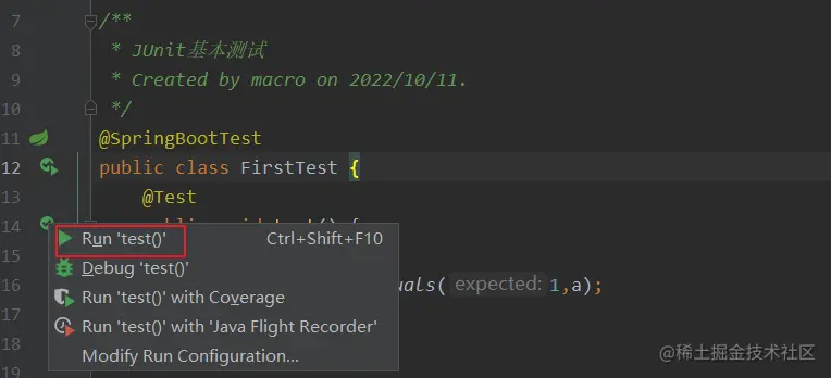 @SpringBootTest注解启用单元测试,使用@Test指定测试方法,使用Assertions类的方法来断言结果是否符合预期,具体代码如下。