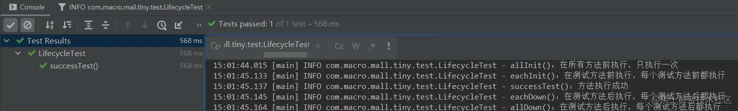 - 执行完成后我们在IDEA的执行窗口中就可以看到方法测试通过了,由于使用