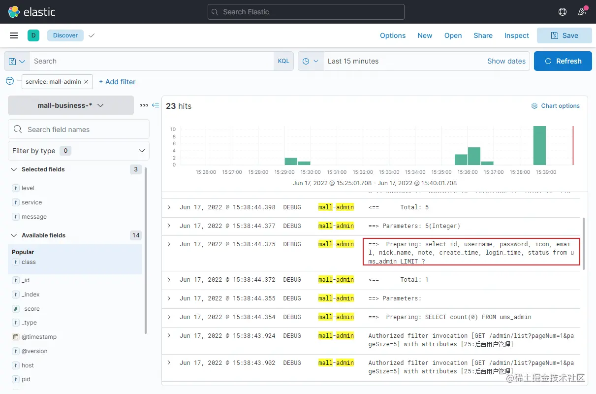 mall-debug日志,这类日志是最全的日志,可用于测试环境调试使用,当我们有多个服务同时产生日志时,我们可以通过过滤器来过滤出对应服务的日志;