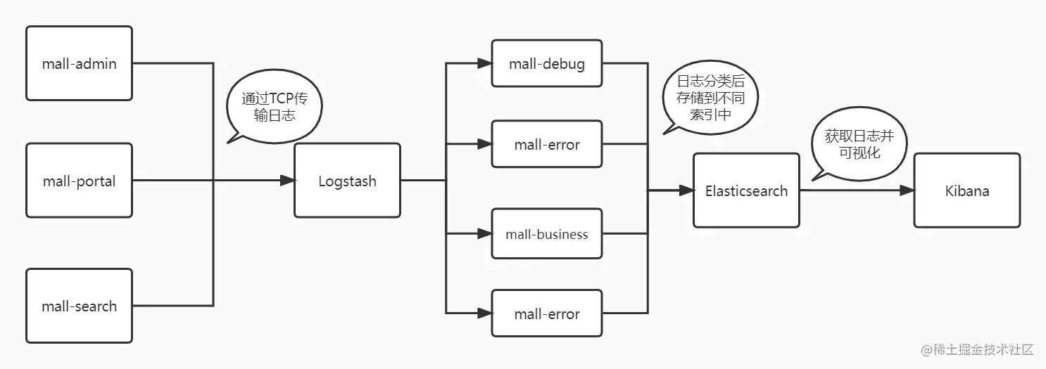 日志收集系统的原理是这样的,首先应用集成了Logstash插件,通过TCP向Logstash传输日志。Logstash接收到日志后根据日志类型将日志存储到Elasticsearch的不同索引上去,Kibana从Elasticsearch中读取日志,然后我们就可以在Kibana中进行可视化日志分析了,具体流程图如下。