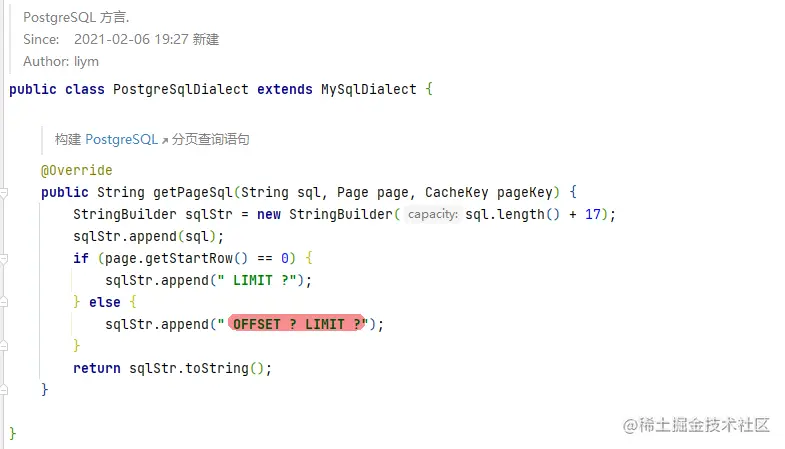 由此,我姑且判断一下,应该是pageHelper的开发者在后期对postgreSQL进行支持,偷懒了一下,直接继承了MySqlDialect,采用了postgreSQL的另一种分页语法 offset ? limit ?。