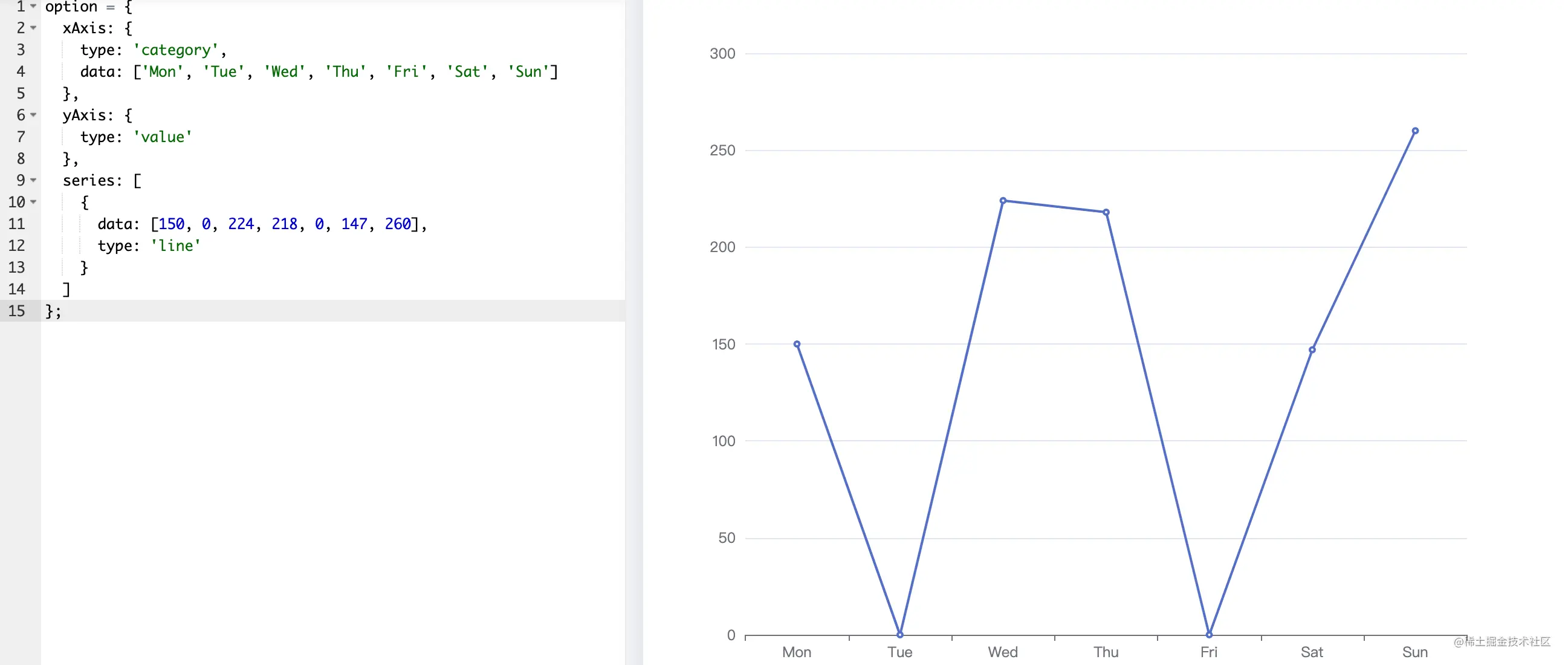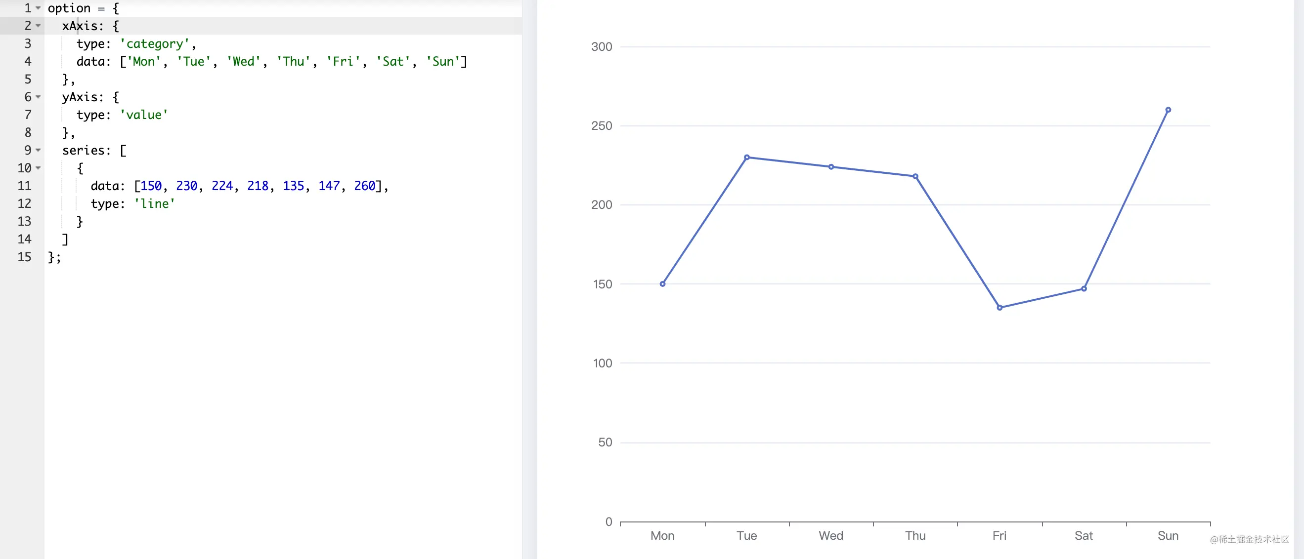 - 想要绘制出这个报表,我们只需要做些横轴纵轴的数据配置即可。但是这里有个要求就是长度上必须对应上。