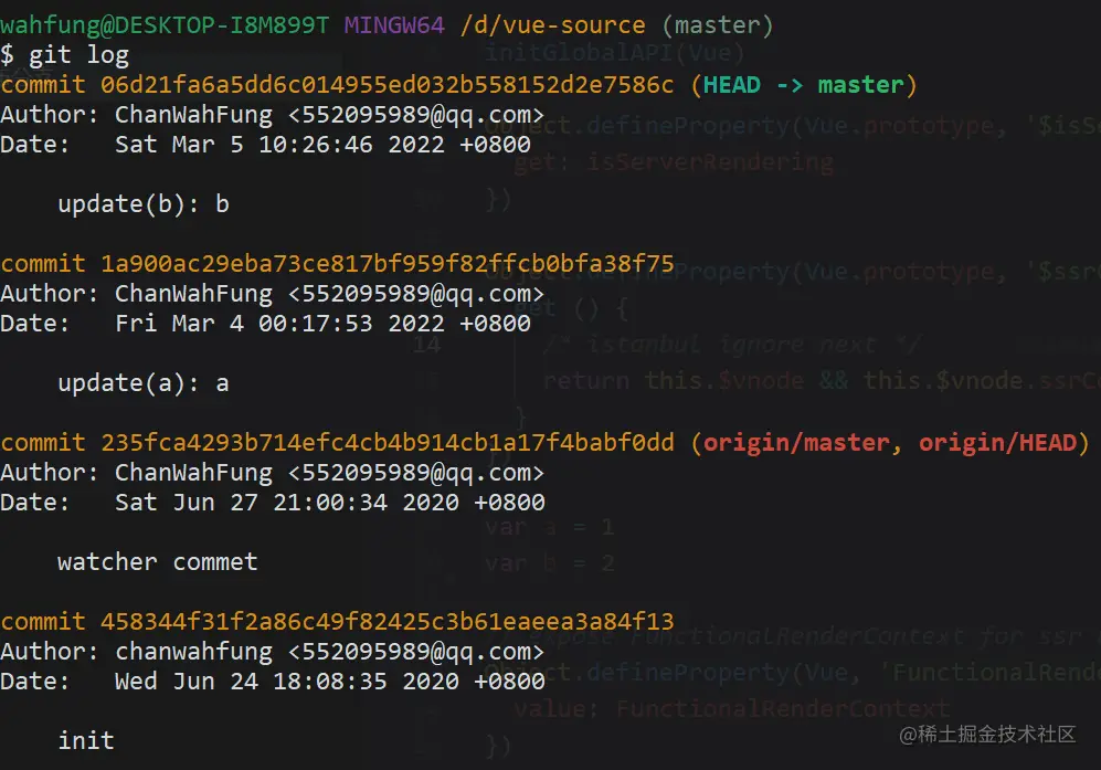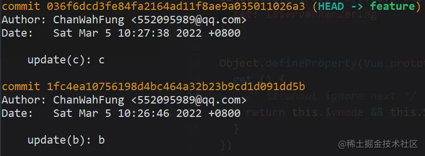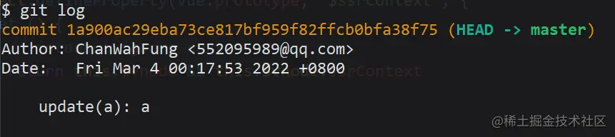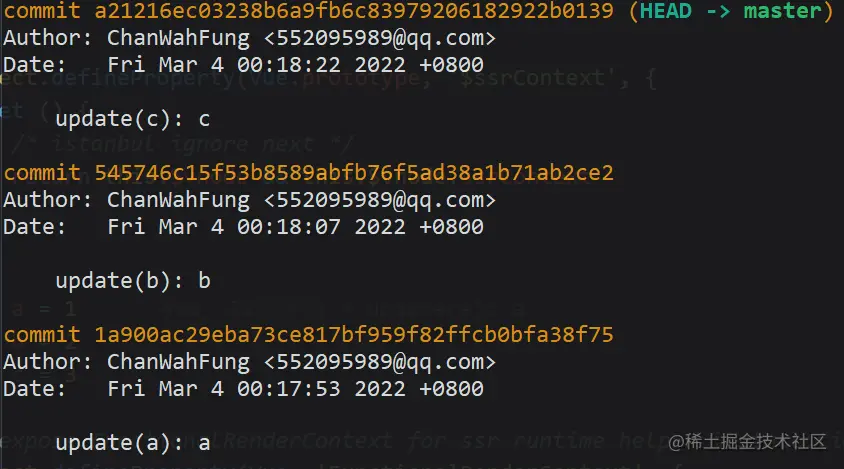 完成后看下最新的 log,b 已经应用到 master,作为最新的 commit 了。可以看到 commitHash 和之前的不一样,但是提交时间还是保留之前的。