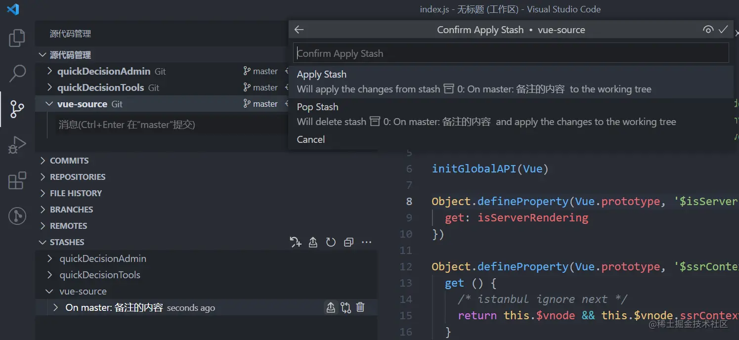 先点击stash记录旁的小箭头,再点击 apply 或者 pop 都可恢复 stash