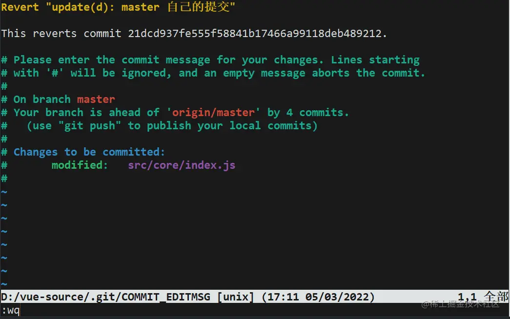 因为 revert 会生成一条新的提交记录,这时会让你编辑提交信息,编辑完后 :wq 保存退出就好了。