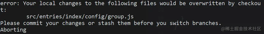 应用场景:某一天你正在 feature 分支开发新需求,突然产品经理跑过来说线上有bug,必须马上修复。而此时你的功能开发到一半,于是你急忙想切到 master 分支,然后你就会看到以下报错:
