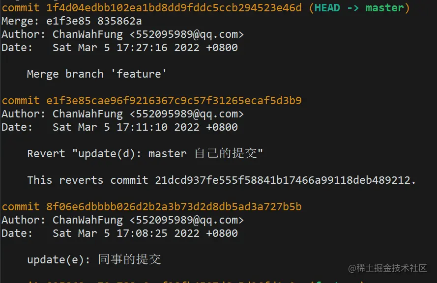 再来看下最新的 log,生成了一条 revert 记录,虽然自己之前的提交记录还是会保留着,但你修改的代码内容已经被撤回了。