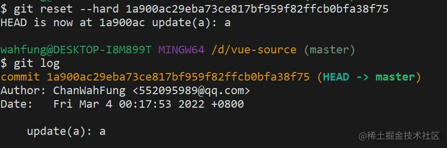 误操作 reset 过头,b 没了,最新的只剩下 a。