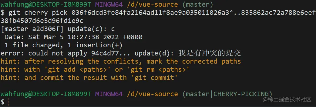 切到 master 分支,使用区间的 cherry-pick。可以看到 c 被成功复制,当进行到 d 时,发现代码冲突,cherry-pick 中断了。这时需要解决代码冲突,重新提交到暂存区。