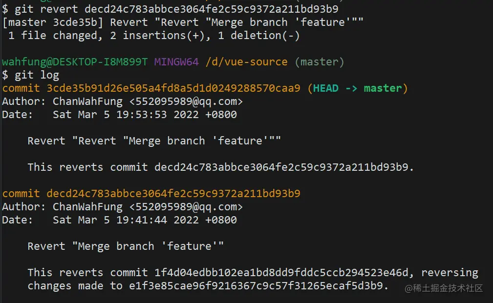这时就需要 revert 掉之前 revert 的合并提交,有点拗口,接下来看操作吧。