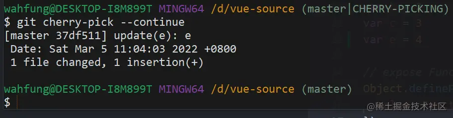 然后使用 cherry-pick --continue 让 cherry-pick 继续进行下去。最后 e 也被复制进来,整个流程就完成了。