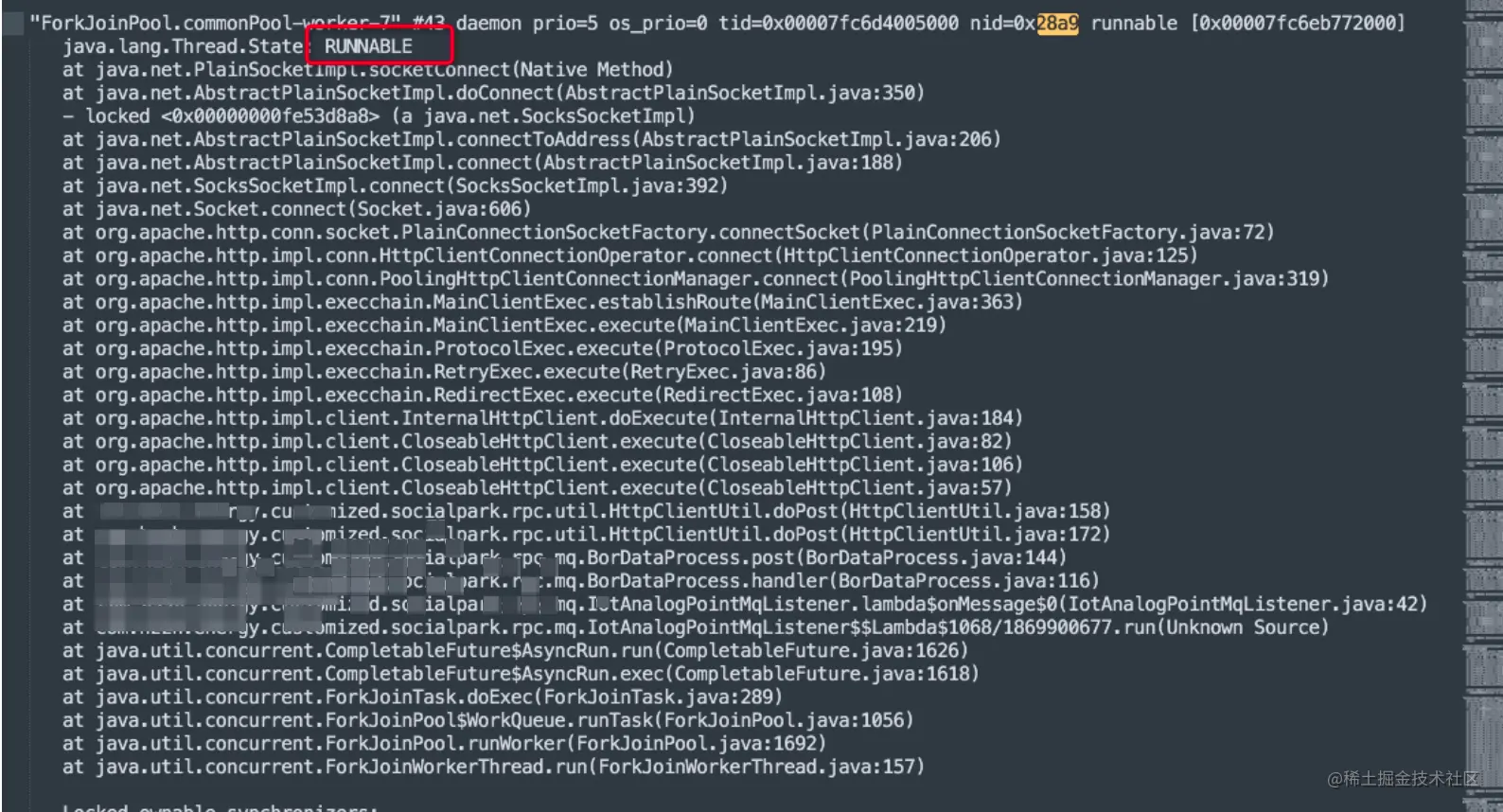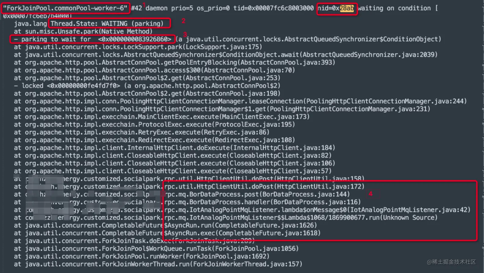这里- parking to wait for <0x00000000fe2081d8>肯定也是MQ消费线程中的某一个。由于MQ消费消息比较多,每秒都会监听到大量的数据,线程的快照日志收集不全。所以在10348.log中没有找到,这不影响我们修改bug。问题的原因已经找到了。