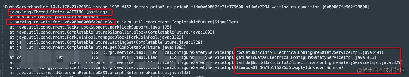 同时我们在线程快照10348.log日志中也看到我们优化的接口对应的线程处于WAITING状态!