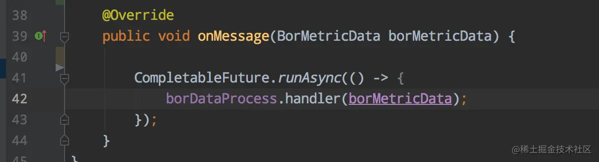 看到线程的快照发现这不是本次修改的接口呀。看到日志4处但是也是用了CompletableFuture。找到对应4处的代码发现这是监听mq消息,然后异步去执行,代码类型这样: