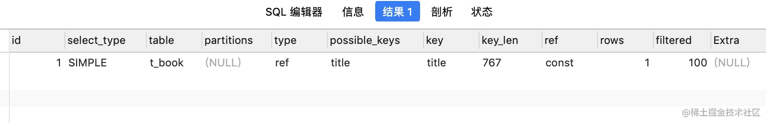 EXPLAIN SELECT * FROM t_book WHERE 1=1 AND title = '且在人间';